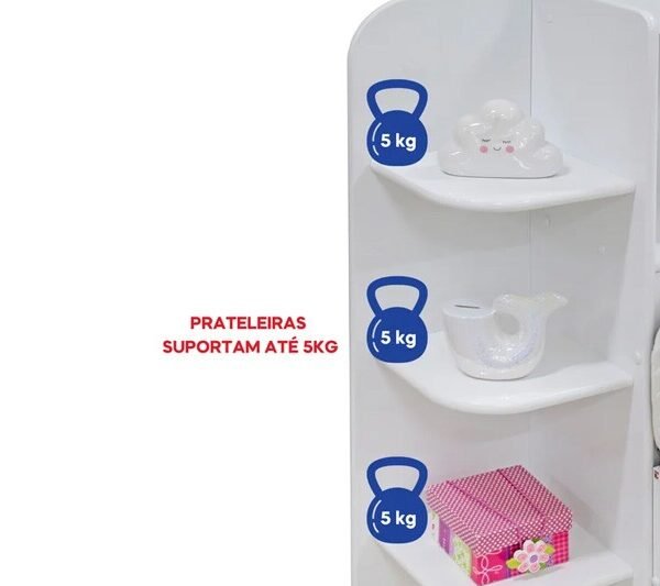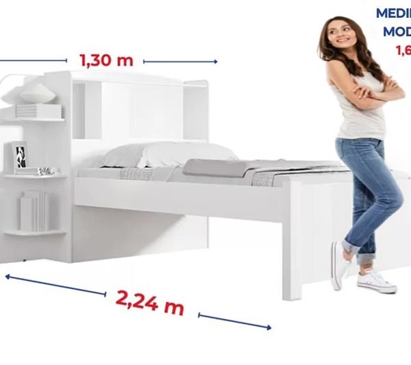 – Prateleira laterais que podem ser usadas para colocar livros, objetos e enfeites. Além disso pode ser montada em ambos os lados da cabeceira.