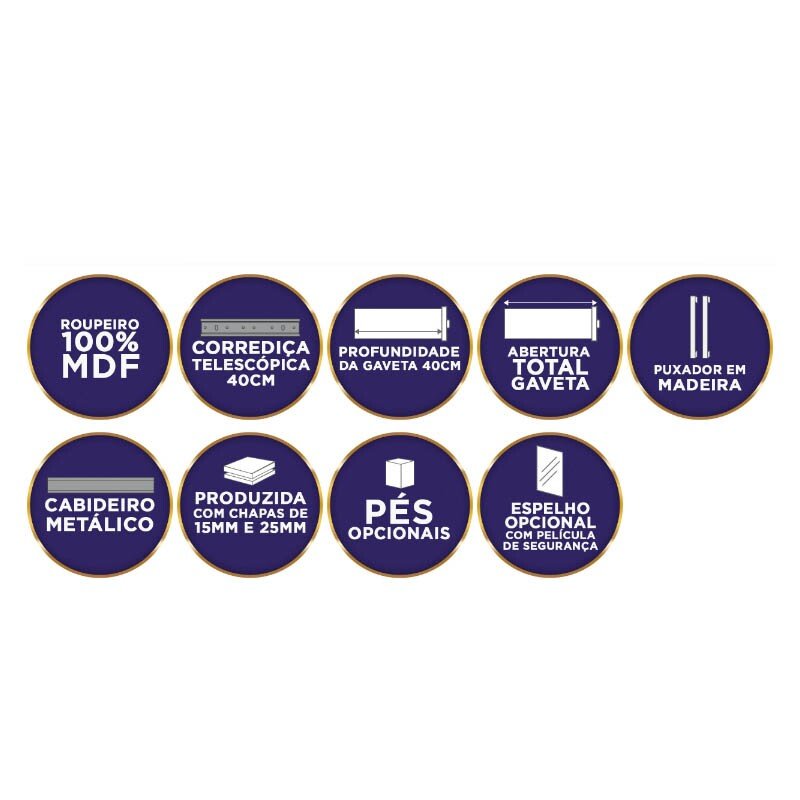– Gavetas: MDF com corrediças telescópicas ? Ou seja, abertura total das gavetas