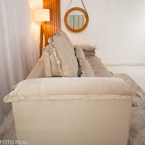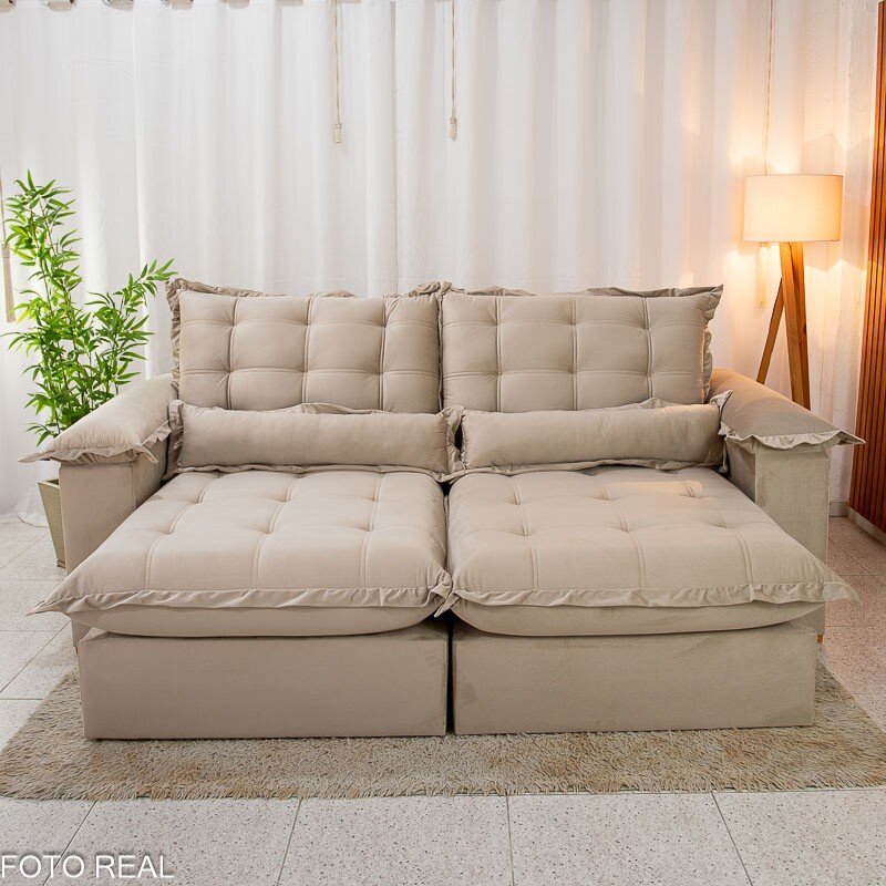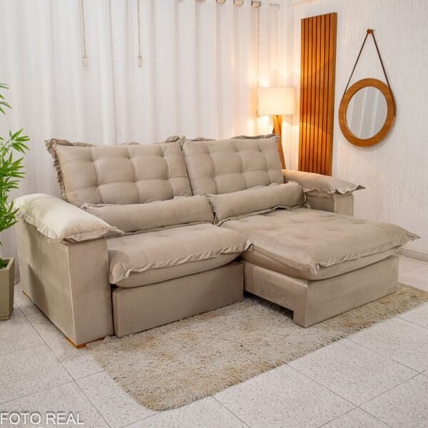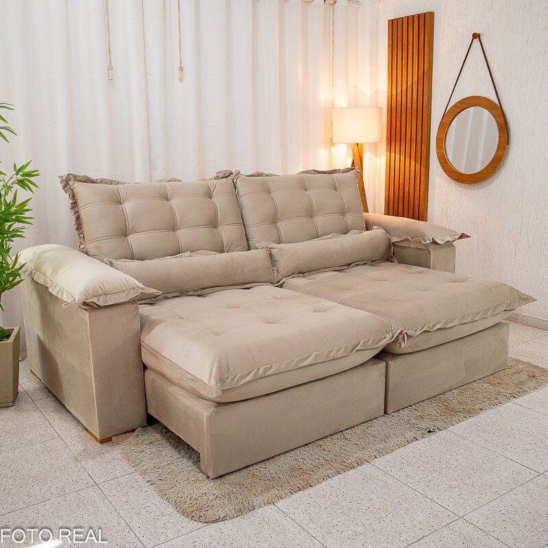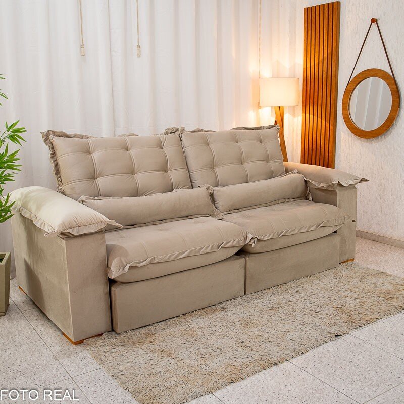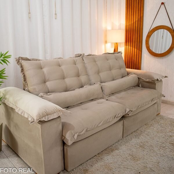 3{%%}Descrição{%%}Sofá Retrátil Reclinável Maldivas 2.50m Veludo Bege A32 – D28 Pró Aditivada